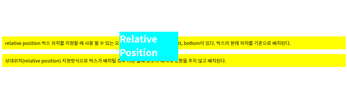 상대위치(relative position) 지정방식으로 박스가 배치될 경우 다른 블록 요소의 배치에 영향을 주지 않고 배치된다.