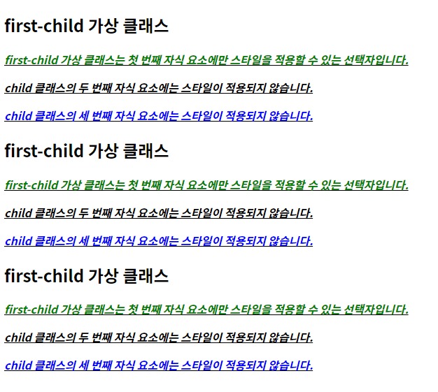 <p>first-child 가상 클래스는 첫 번째 자식 요소에만 스타일을 적용할 수 있는 선택자입니다.</p>
