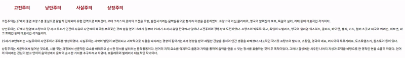 <p id="c">19세기 후반부터는 사실주의와 자연주의가 주류를 형성하였다. 사실주의는 과학의 발달이 보편화되고 과학적으로 사물을 따지려는 경향이
